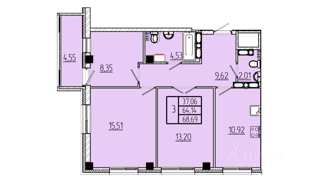 Продаётся 3-комнатная квартира в строящемся доме (Строение 3), срок сдачи: III-кв. 2026, общей площадью 68.69 кв.м., на 16 этаже.