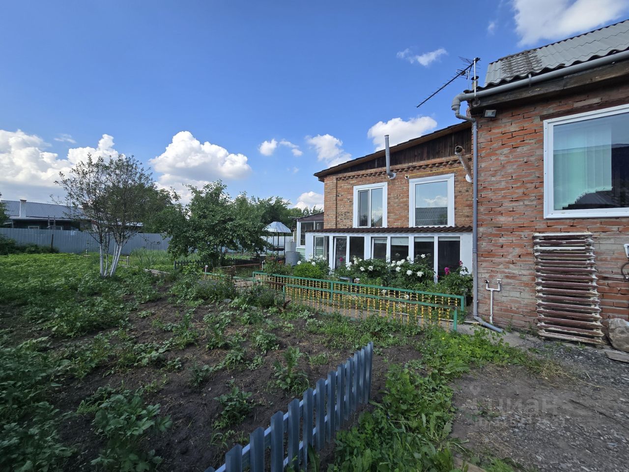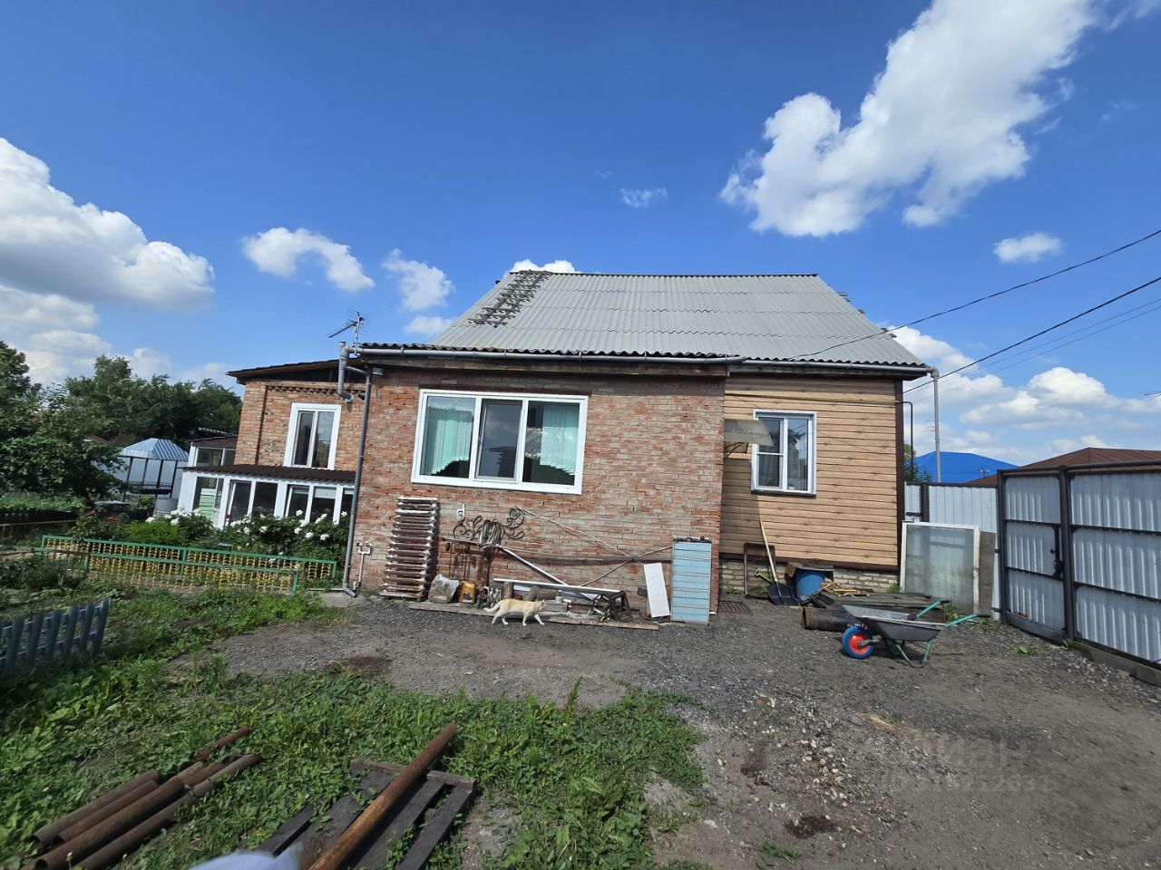 Построен из кирпича и бруса, снаружи отделка - сайдинг. Дом очень теплый!