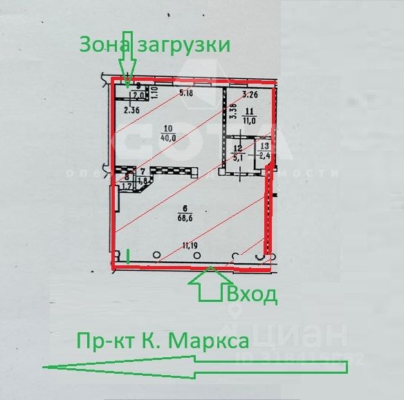 Помещение расположено на первом этаже, имеет Два входа (с Маркса и с обратной стороны здания). Рядом - выстроенный торговый ряд из федеральных и региональных игроков рынка.