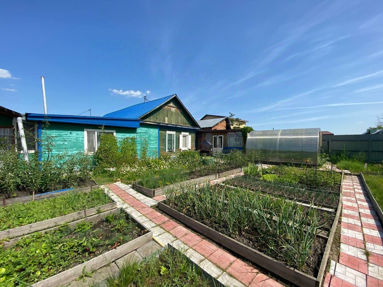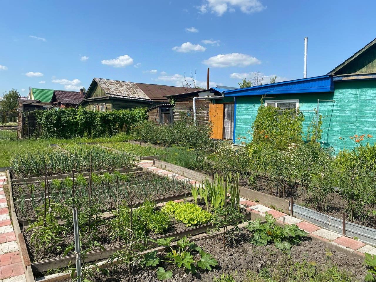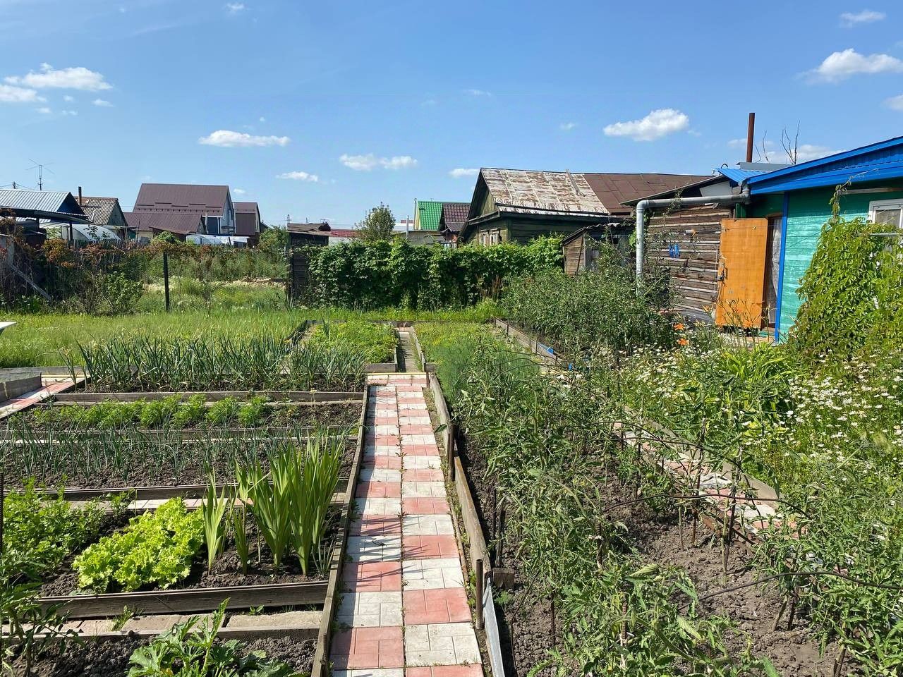 Зоны участка дорожки выложены тротуарной плиткой, грядки ровные обособленные. Растет все необходимое.