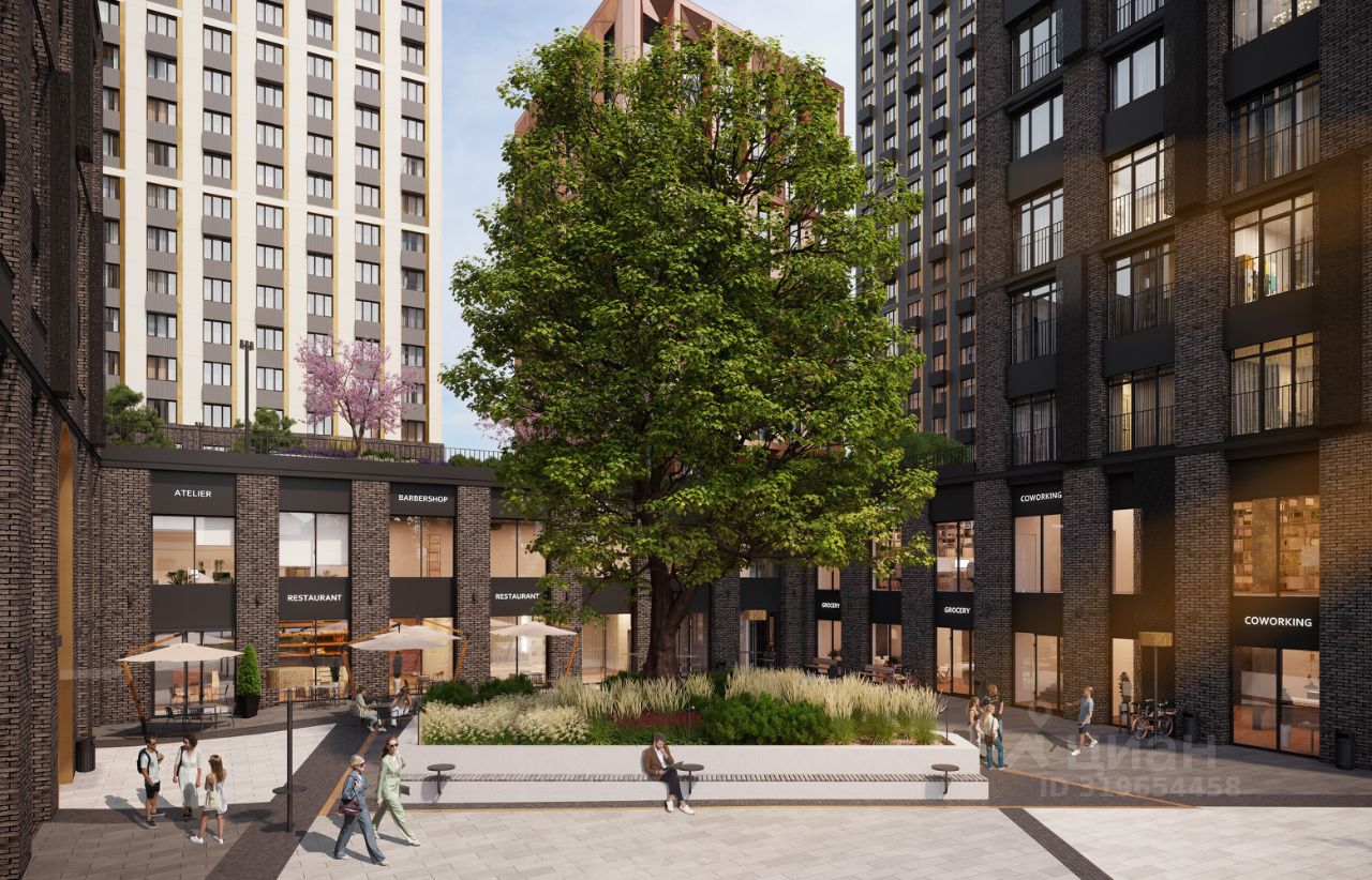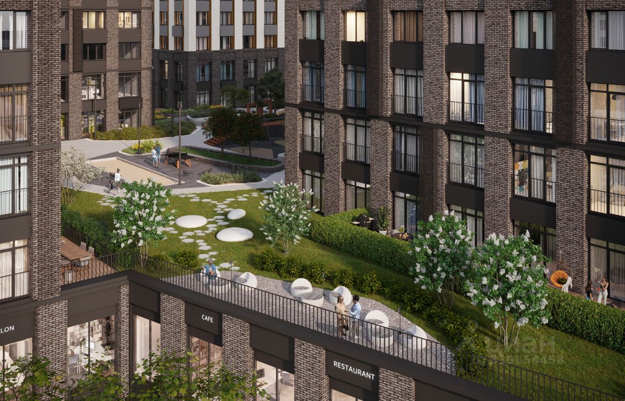 Собственная инфраструктура ЖК - линия коммерческих помещений с магазинами, кафе и ресторанами