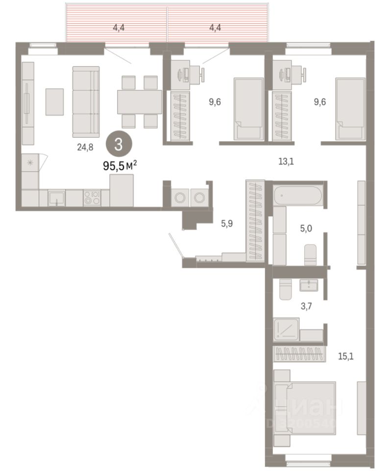 Квартира с кухней-гостиной и тремя спальнями в Кварталах Драверта. Особенности планировки: балкон, окна на две стороны, предчистовая отделка, разнесённые спальни. квартиры в нашей базе: ДВТ03-Ж5.5.1.