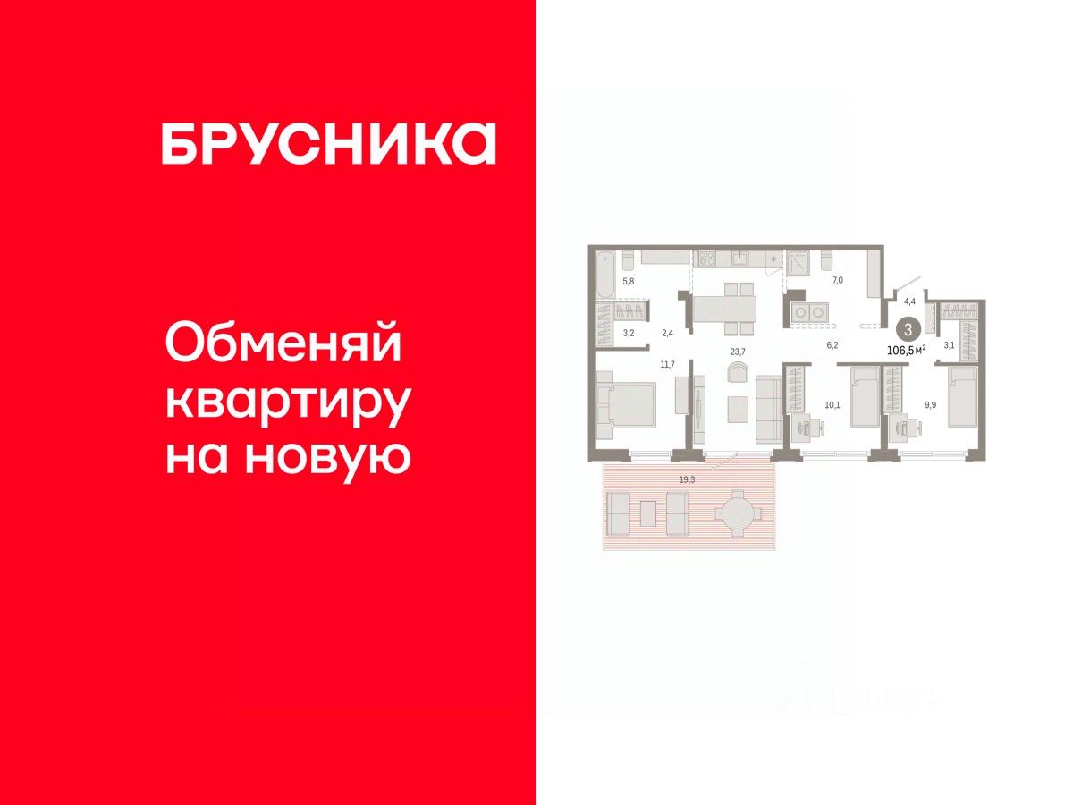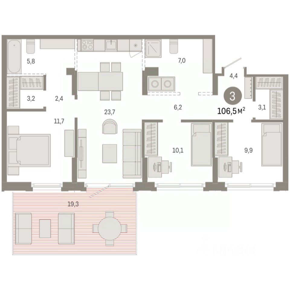 Квартира с кухней-гостиной и тремя спальнями в Кварталах Драверта. Особенности планировки: предчистовая отделка, разнесённые спальни. квартиры в нашей базе: ДВТ03-Ж1.1.1.