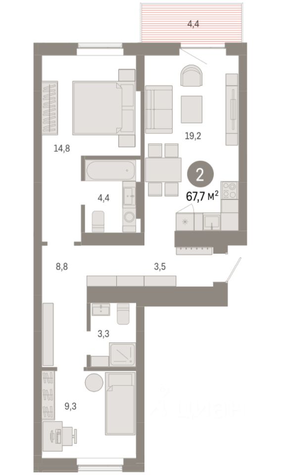 2-комн. квартира от застройщика с предчистовой отделкой в Кварталы Драверта на 4 этаже. Общая площадь: 67.69 кв.м., жилая: 24.1 кв.м., площадь просторной кухни-гостиной: 19.2 кв.м. Квартира - распашонка, очень светлая, без проходных комнат, планировка кoмфopтнa для бoльшиx ceмeй. В квартире один балкон, два совмещенных санузла. Высота потолков 2.7 м.