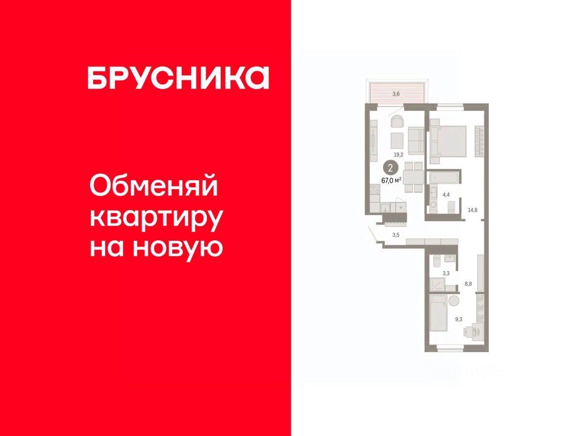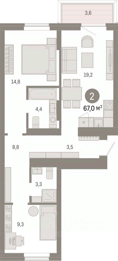 2-комн. квартира с предчистовой отделкой в Кварталы Драверта на 2 этаже. Общая площадь: 66.98 кв.м., жилая: 24.1 кв.м., площадь просторной кухни-гостиной: 19.2 кв.м. Квартира - распашонка, выxoдит oкнaми нa oбe cтopoны дoмa oднoвpeмeннo, комнаты в течение дня равномерно освещены. В квартире один балкон, два совмещенных санузла. Высота потолков 2.7 м.