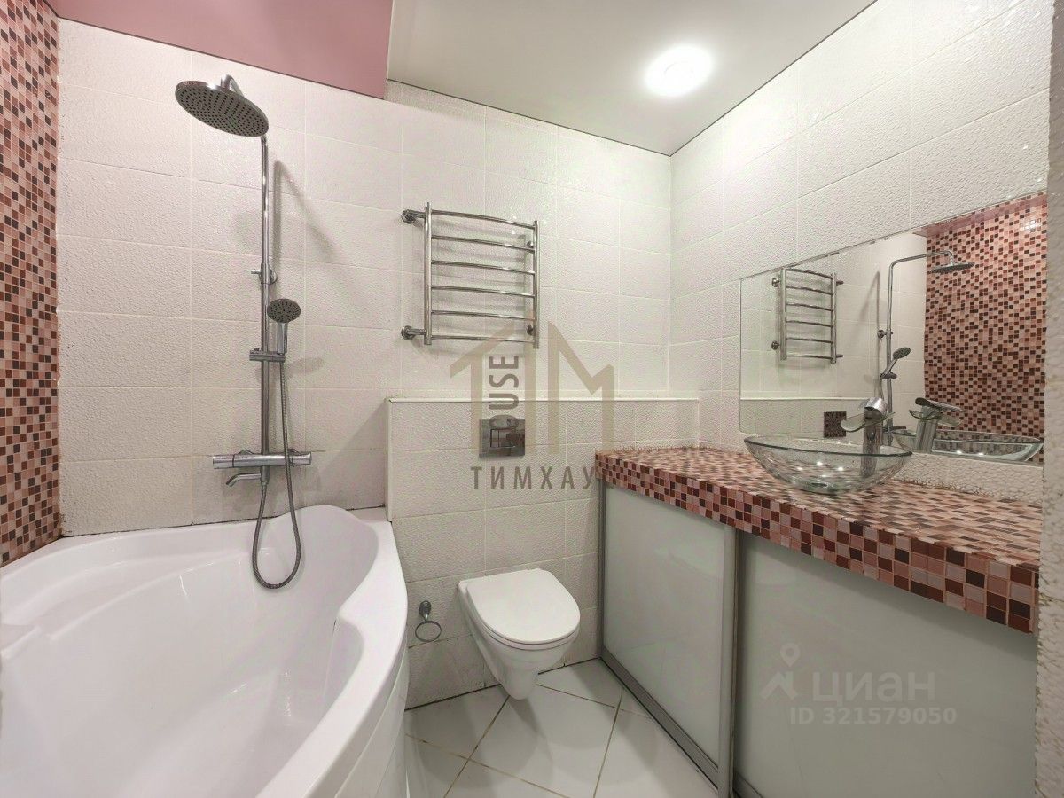 Санузел совмещённый и облицован кафелем в современном стиле.