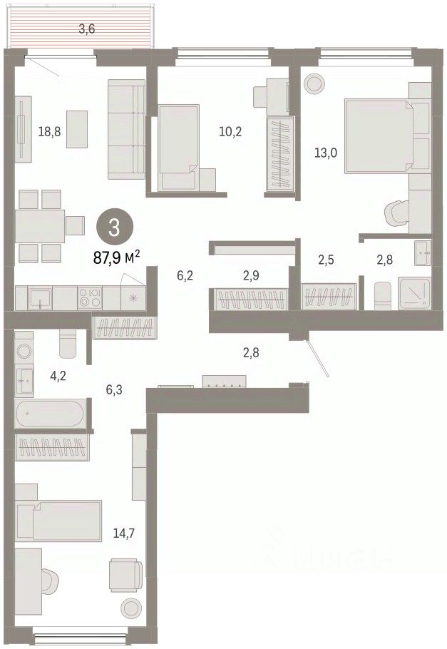 Квартира с кухней-гостиной и тремя спальнями в Кварталах Драверта. Особенности планировки: балкон, окна на две стороны, предчистовая отделка, разнесённые спальни. квартиры в нашей базе: ДВТ06-Ж4.5.2.