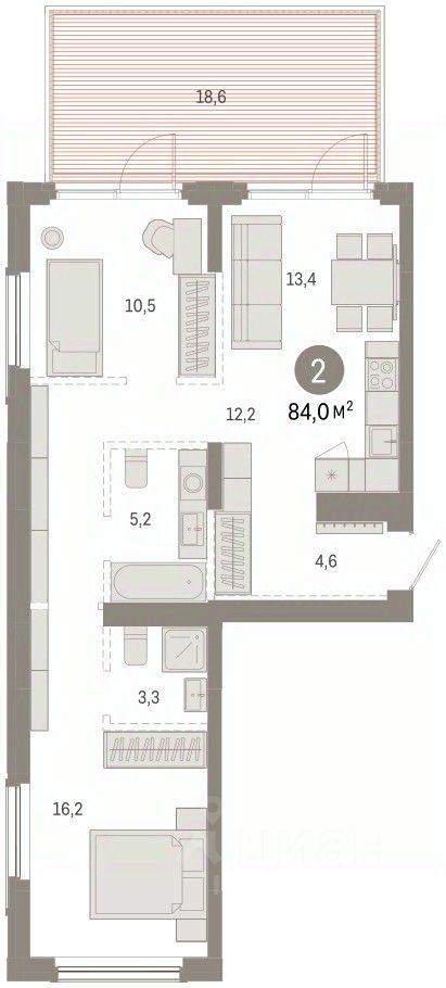 Квартира с кухней-гостиной и двумя спальнями в Кварталах Драверта. Особенности планировки: разнесённые спальни, свободная планировка. квартиры в нашей базе: ДВТ06-Ж6.2.5.