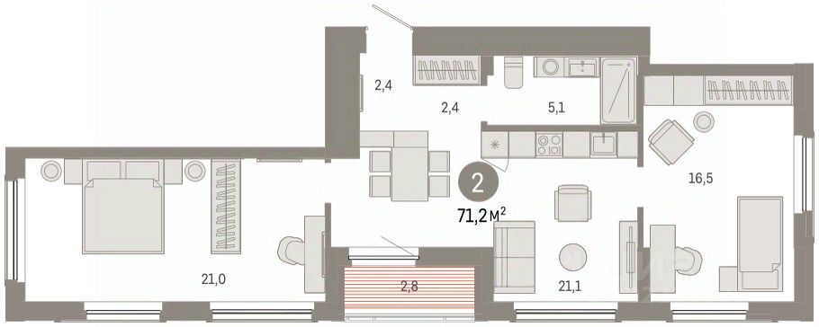 Квартира с кухней-гостиной и двумя спальнями в Кварталах Драверта. Особенности планировки: предчистовая отделка, разнесённые спальни, тёплая лоджия. квартиры в нашей базе: ДВТ06-Ж1.2.2.