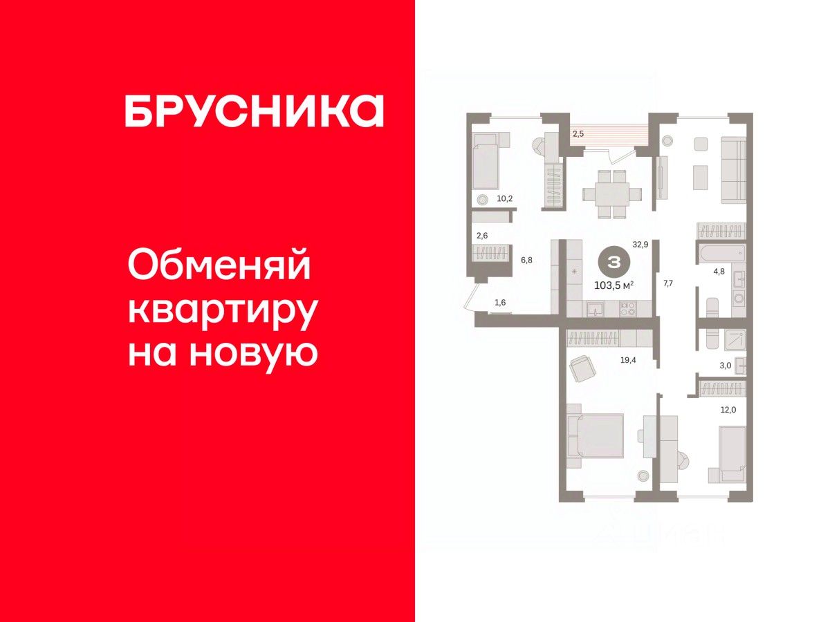 Просторная 3-комн. квартира с предчистовой отделкой в Кварталы Драверта на 8 этаже. Общая площадь: 103.49 кв.м. Высота потолков 2.82 м.