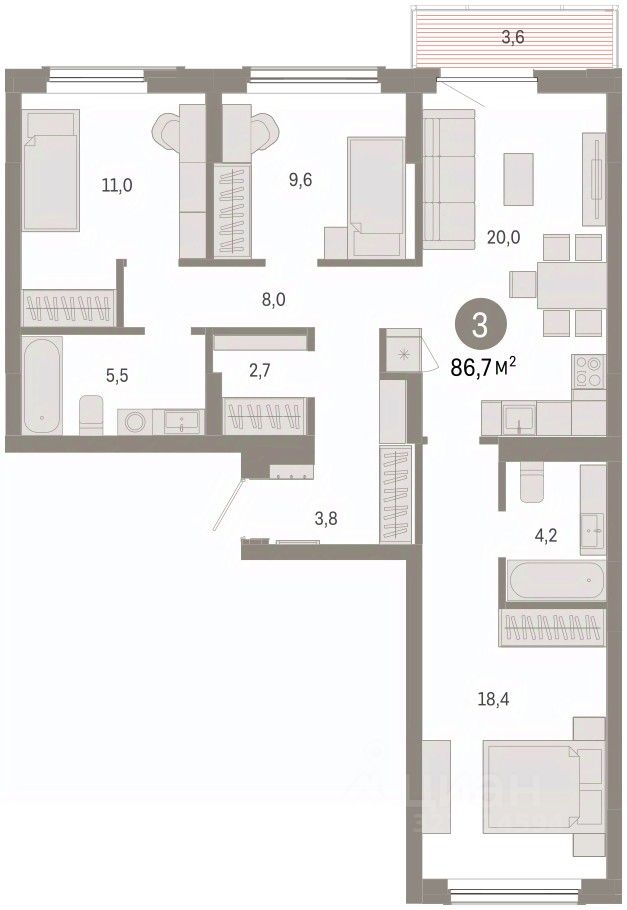 Квартира с кухней-гостиной и тремя спальнями в Кварталах Драверта. Особенности планировки: балкон, окна на две стороны, предчистовая отделка, разнесённые спальни. квартиры в нашей базе: ДВТ06-Ж3.5.2.