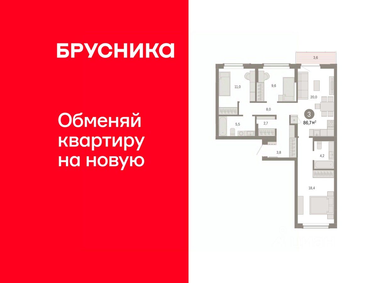 Квартира с кухней-гостиной и тремя спальнями в Кварталах Драверта. Особенности планировки: балкон, окна на две стороны, предчистовая отделка, разнесённые спальни. квартиры в нашей базе: ДВТ06-Ж3.4.2.