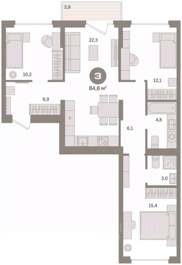 Квартира с кухней-гостиной и тремя спальнями в Кварталах Драверта. Особенности планировки: балкон, вид во двор, мастер-спальня, окна на две стороны, предчистовая отделка, разнесённые спальни. квартиры в нашей базе: ДВТ06-Ж6.4.1.