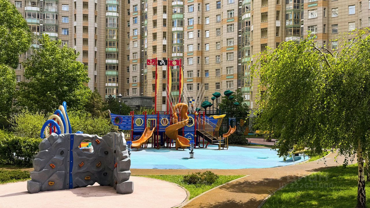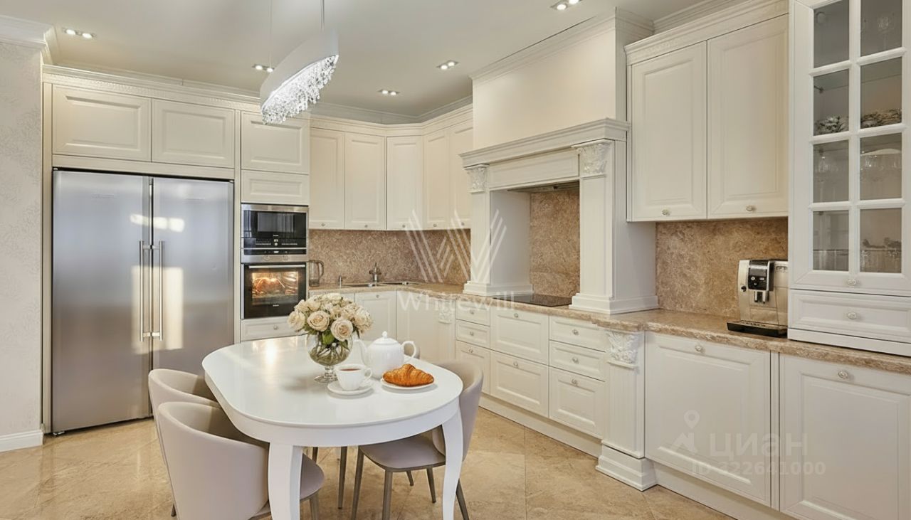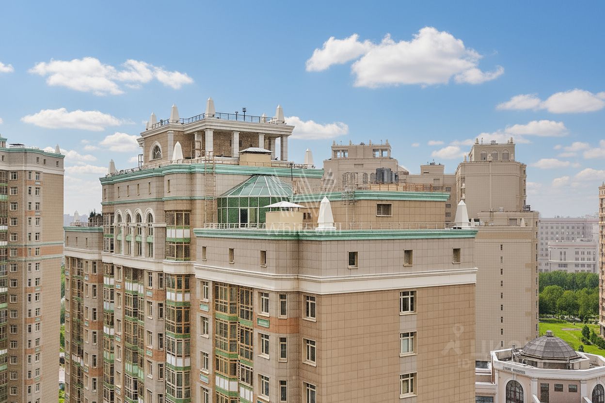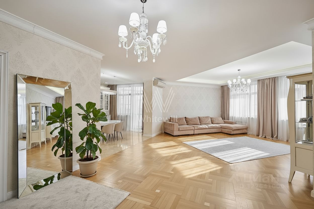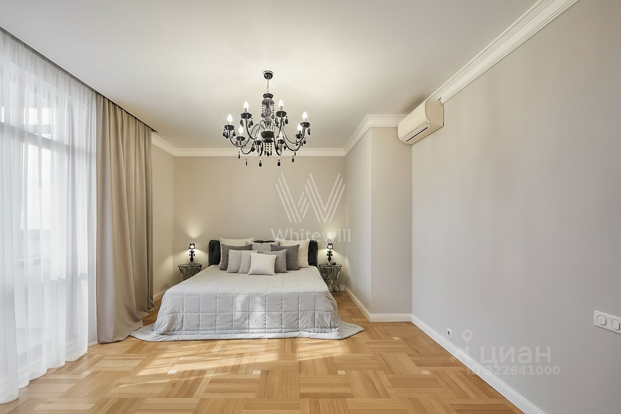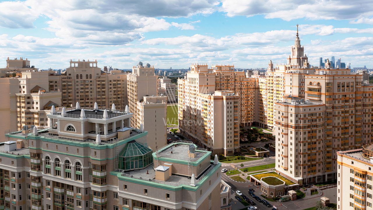 Квартира с тремя спальнями в комплексе бизнес-класса ''Доминион'' в Раменках. Квартира общей площадью сто восемьдесят семь м² расположена на четырнадцатом этаже в пятом корпусе. Выполнена дизайнерская отделка в современном стиле, на полу выложены паркетная доска и мрамор. Квартира укомплектована итальянской мебелью и премиальной техникой.
