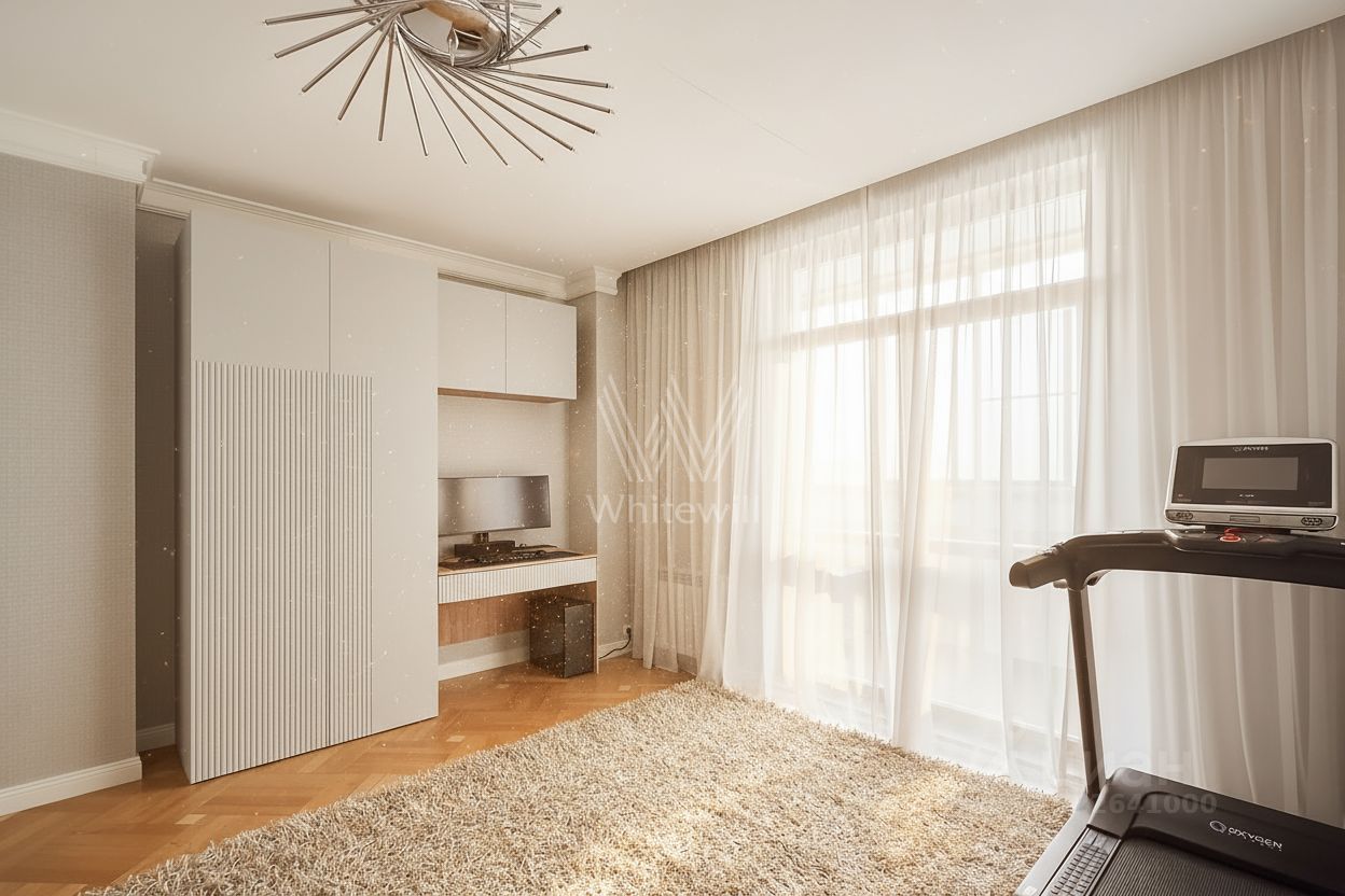 Установлены премиальные двери Union, деревянные стеклопакеты и система индивидуального кондиционирования. Функциональная планировка включает кухню-гостиную, три спальни, 2 санузла, две гардеробные, 3 лоджии и холл. Окна ориентированы на три стороны, открываются виды на город и благоустроенную территорию комплекса. Предусмотрено машиноместо за отдельную плату.