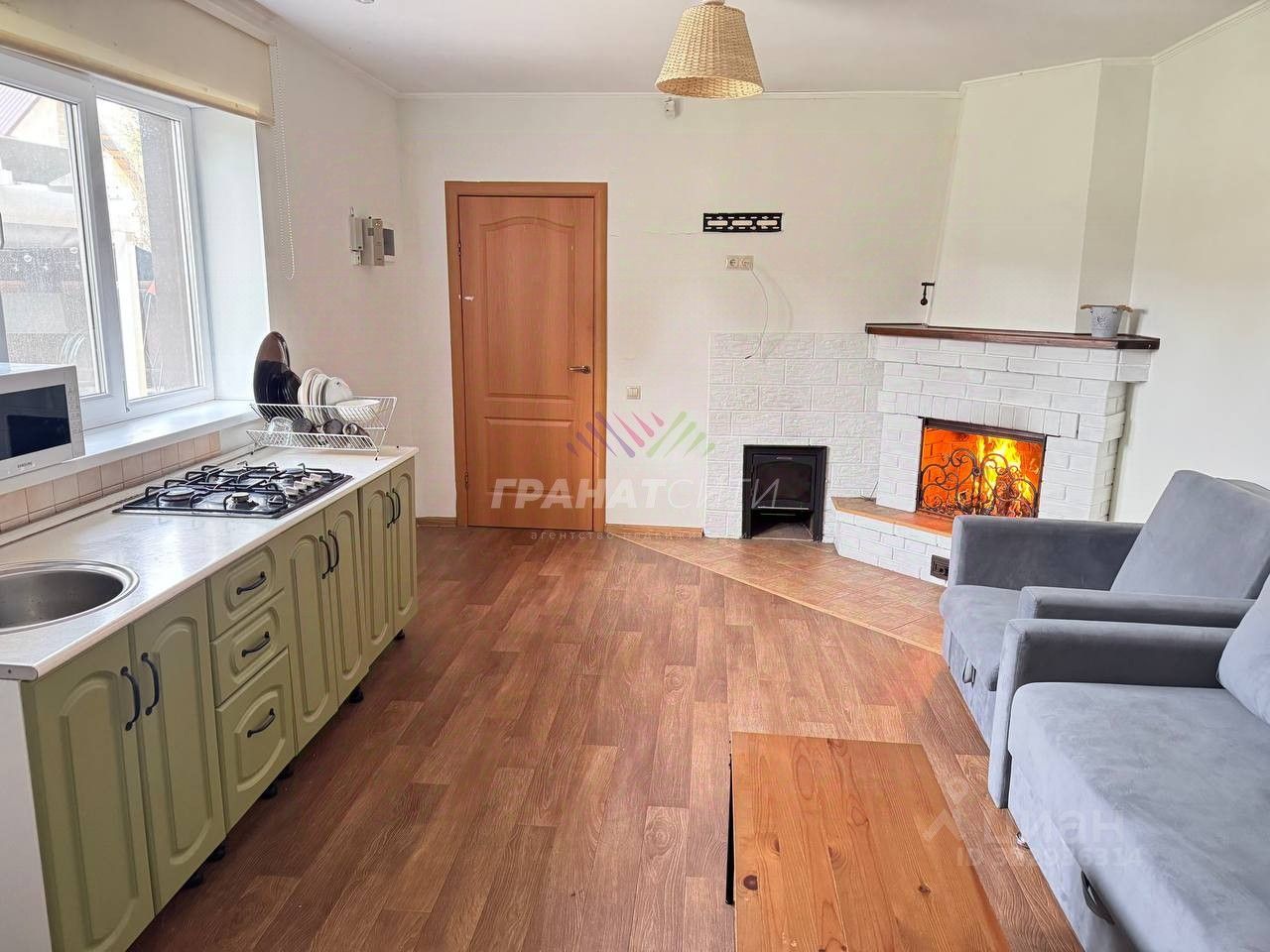 * Дом разделен на зоны, есть возможность достроить второй этаж. * Просторная баня (на 6 человек), душевая и санузел в доме. * Светлая гостиная с кухней и камином. Диван и кресло раскладываются в спальные места.