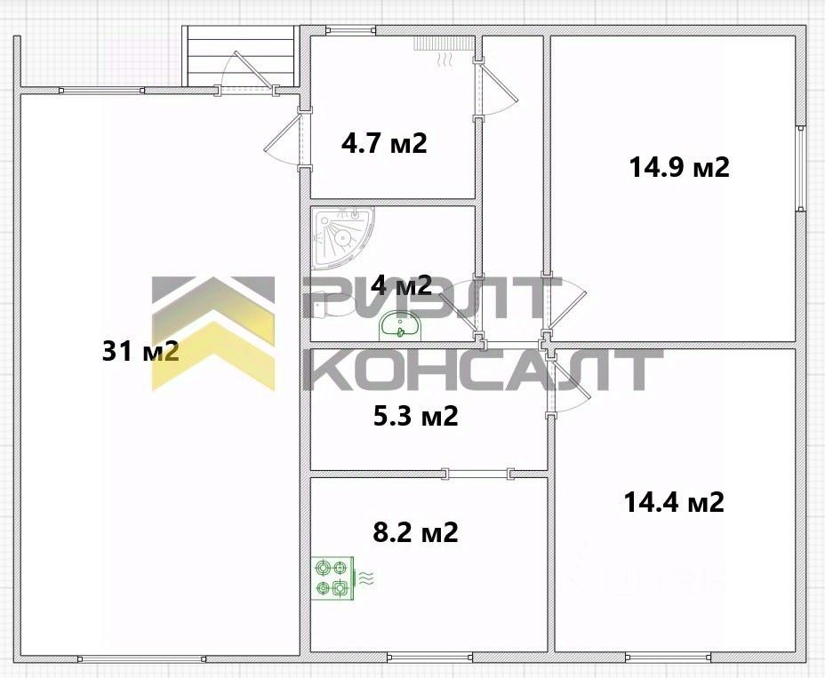 В доме: две изолированные комнаты 14.9кв.м, 14.4кв.м, кухня 8.2кв.м, совмещенный санузел 4кв.м, входная группа 31кв.м.