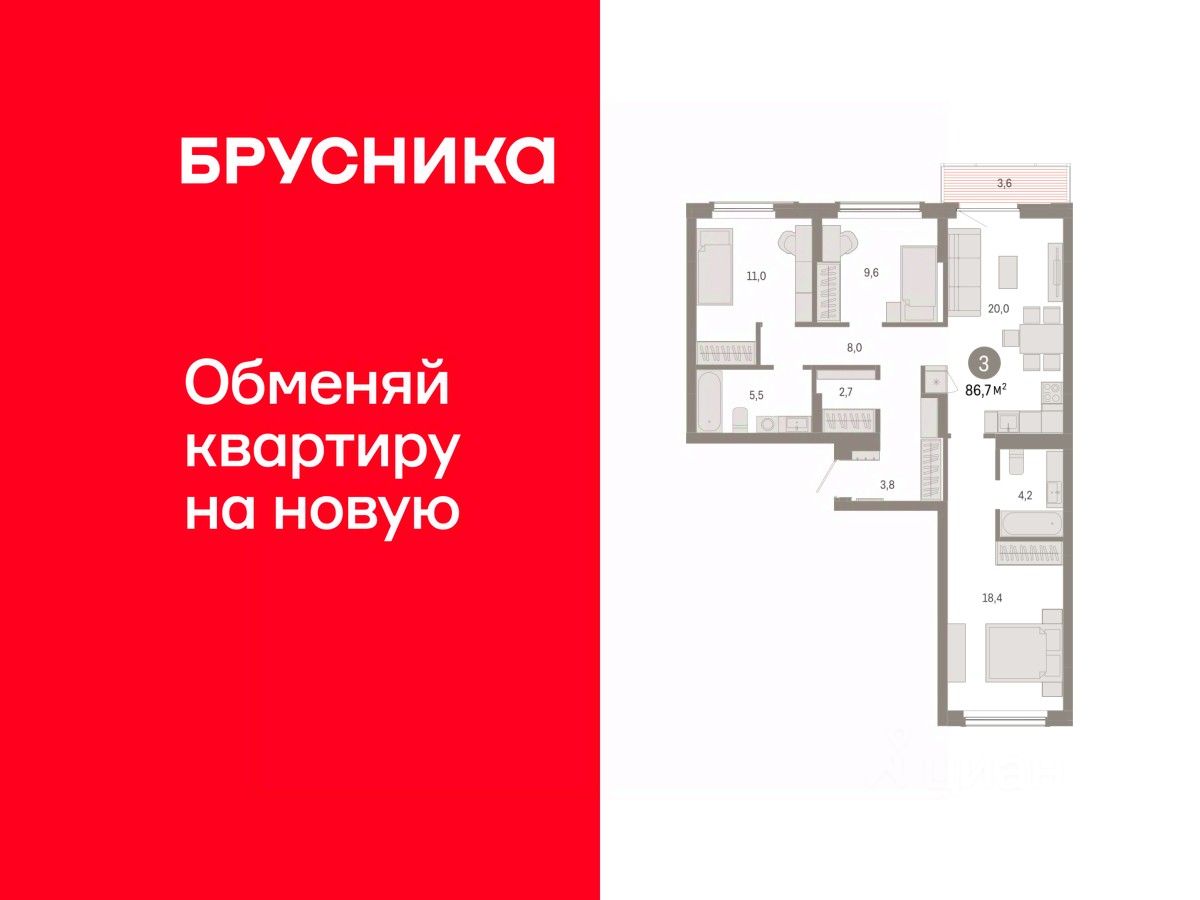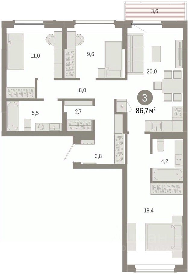 Квартира с кухней-гостиной и тремя спальнями в Кварталах Драверта. Особенности планировки: балкон, окна на две стороны, предчистовая отделка, разнесённые спальни. квартиры в нашей базе: ДВТ06-Ж3.6.2.