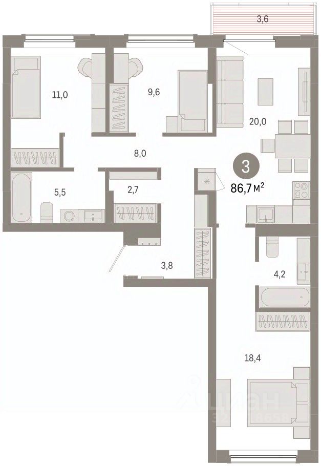 Квартира с кухней-гостиной и тремя спальнями в Кварталах Драверта. Особенности планировки: балкон, окна на две стороны, предчистовая отделка, разнесённые спальни. квартиры в нашей базе: ДВТ06-Ж3.6.2.