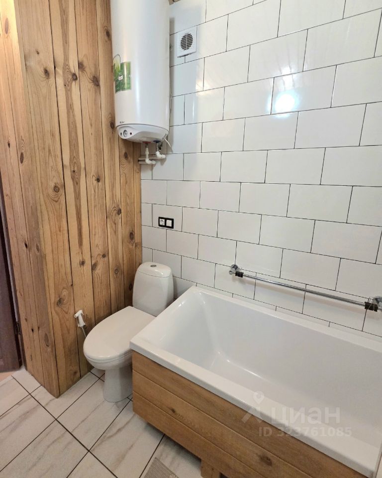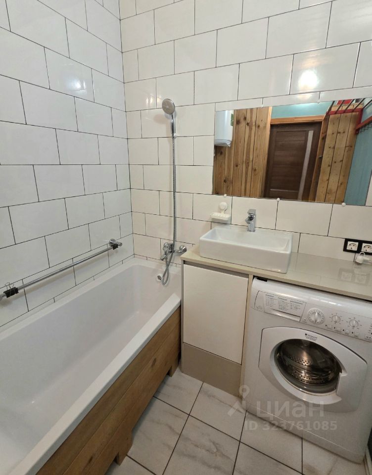 Просторный санузел оборудован раковиной, ванной с экраном, стиральной машиной, стеллажом для хранения и бойлером. Также установлен гигиенический душ.