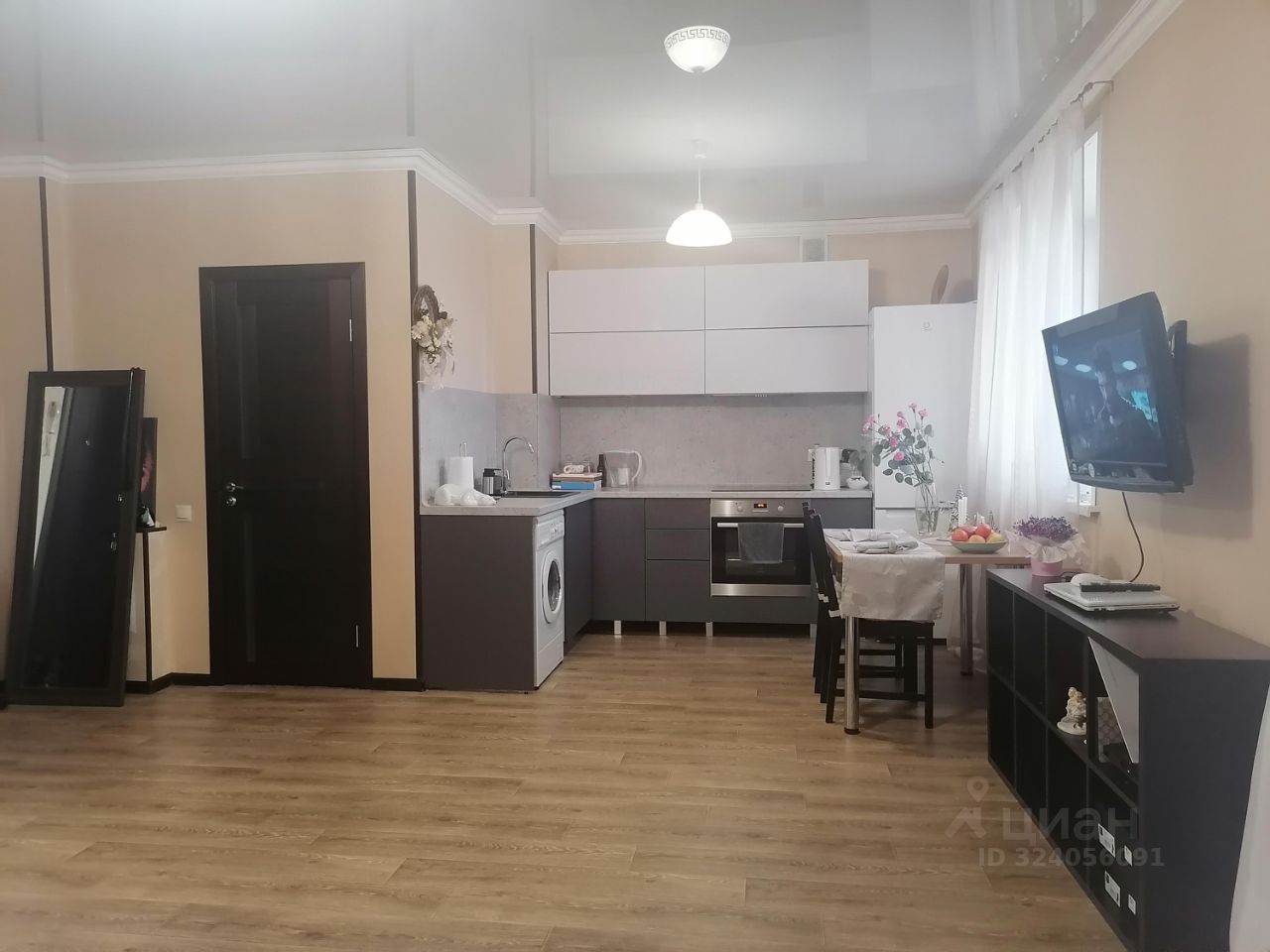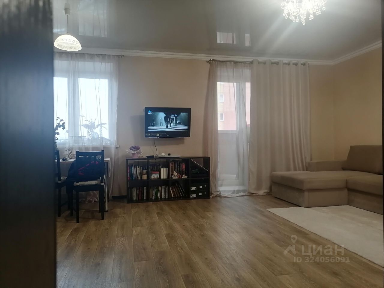 В квартире остается кухонный гарнитур, варочная панель, духовой шкаф, люстры, шторы и гардины, вместительный шкаф - купе.