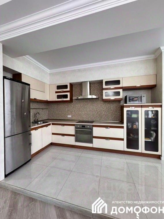В кухне- гостиной установлен встроенный кухонный гарнитур, современный и максимально удобный в использовании, полностью оборудованный зонами хранения и бытовой техникой.