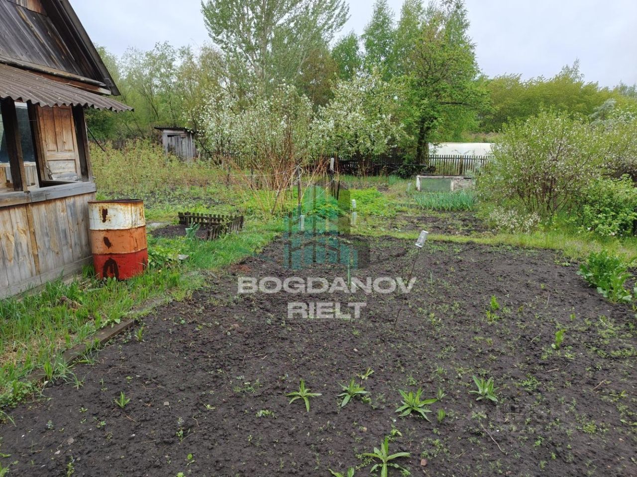 **Участок 4,53 сотки - настоящий сад-рай!** Плодородная земля и **богатый сад**: малина, вишня, яблони, облепиха, чёрная смородина - всё растёт и плодоносит! Участок **полностью огорожен**: спереди - металлический прут, по периметру - деревянный штакетник. На территории - **металлический сарай** (переоборудован из корабельной рубки - уникальная находка!).