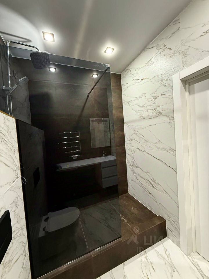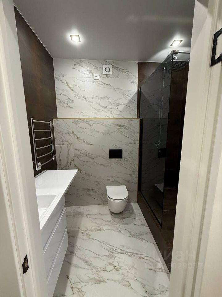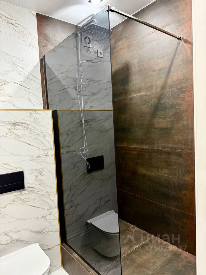 Стильным решением ремонта квартиры является подвесная тумба с раковиной, зеркало, система инсталляции с подвесным унитазом, стеклянная душевая перегородка.