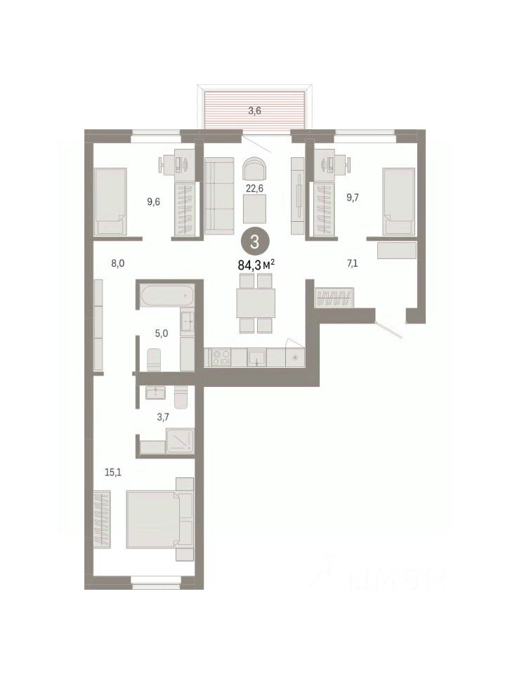 Квартира с кухней-гостиной и тремя спальнями в Кварталах Драверта. Особенности планировки: балкон, новые лоты, окна на две стороны, предчистовая отделка, разнесённые спальни. квартиры в нашей базе: ДВТ03-Ж4.2.3.