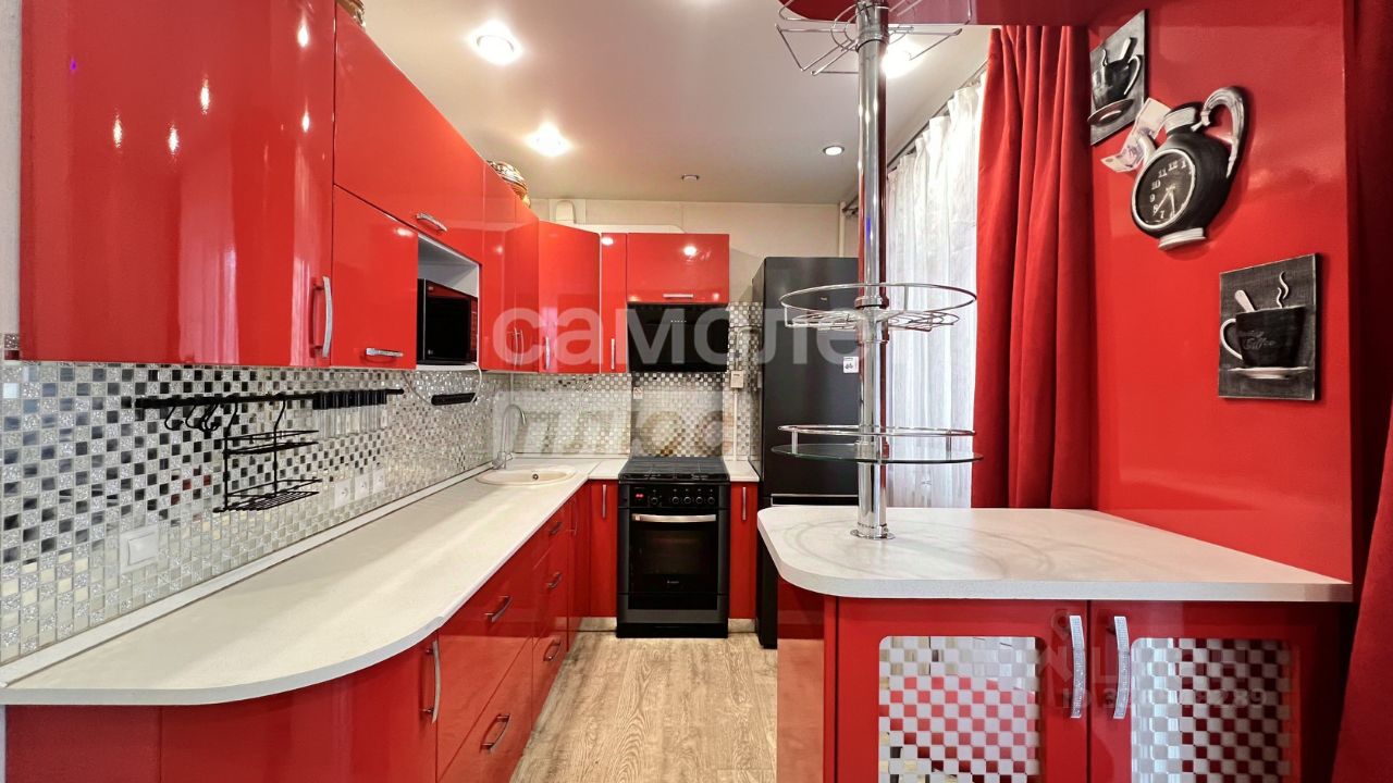 Вам не придется беспокоиться о мебели! При продаже остается: Вместительные шкафы-купе с зеркальными дверьми в прихожей, спальне и детской. Красивая детская кровать, письменный стол со шкафами и полками. Двуспальная кровать с комфортным матрасом. Стильный кухонный гарнитур алого цвета с барной стойкой и зеркальной мозаикой на фартуке.