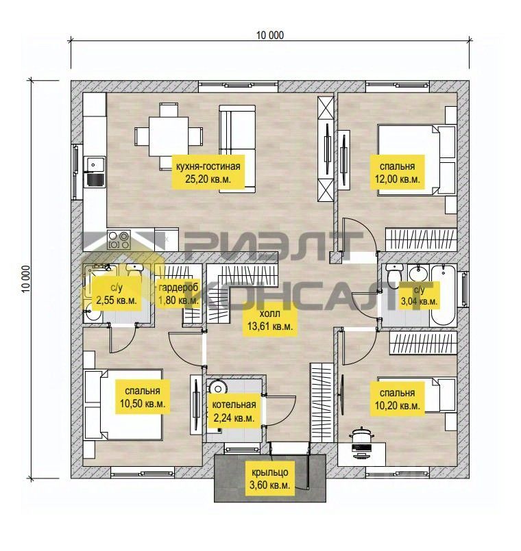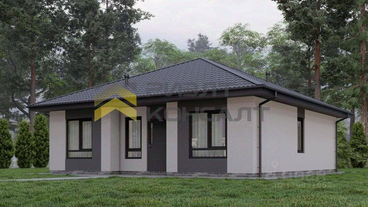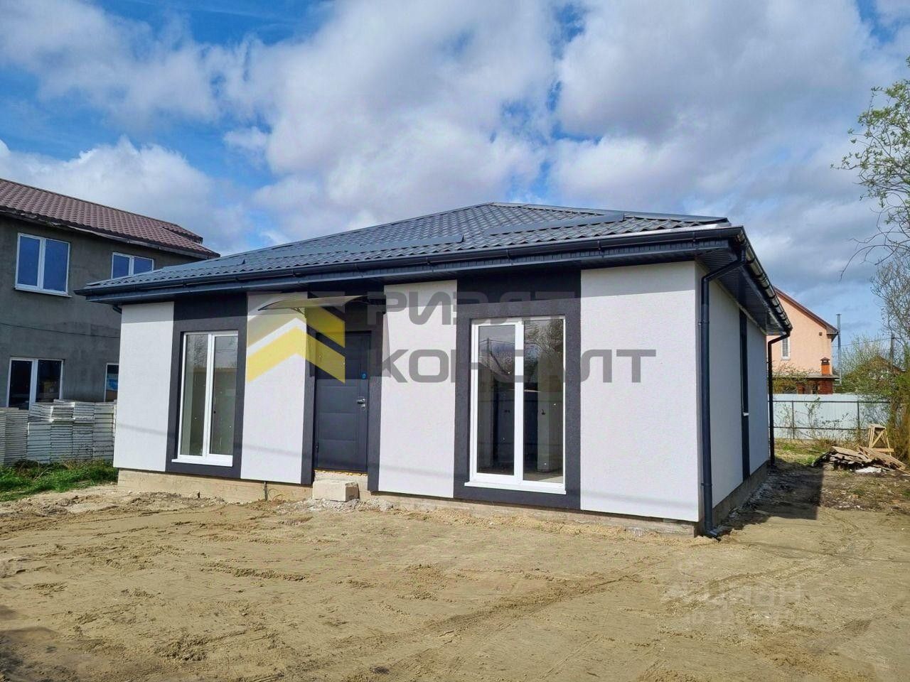 Дом на ленточном фундаменте, из газобетонных блоков 300 с оштукатуренным фасадом. В предчистовую отделку входят: *плитный фундамент согласно проекту *стены из газоблока *армопояс, вент.