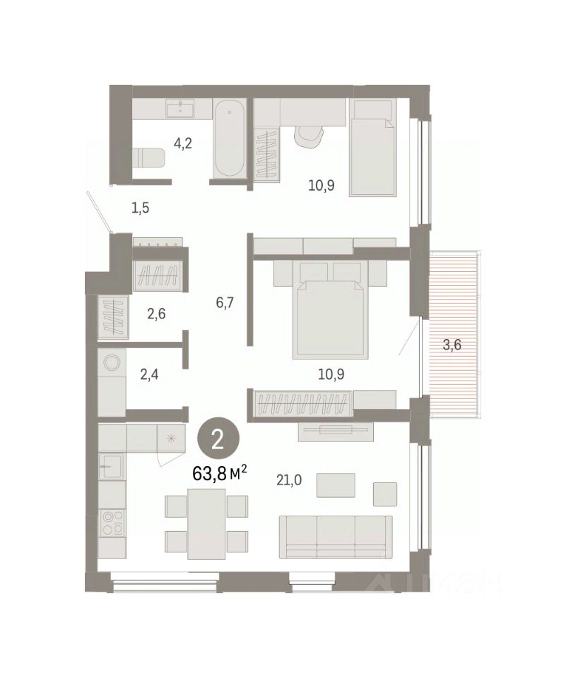 2-комн. квартира с предчистовой отделкой в Кварталы Драверта на 3 этаже. Общая площадь: 63.8 кв.м. Высота потолков 2.82 м.