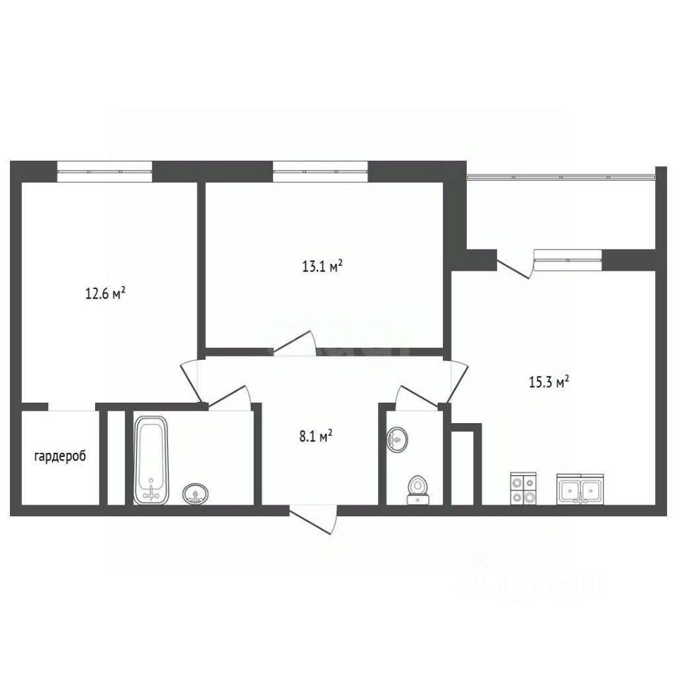Квартира в черновой отделке, общей площадью 59,5 кв.м., кухня 15,3 кв.м. с выходом на лоджию, 2 изолированные комнаты, раздельный санузел и гардеробная.